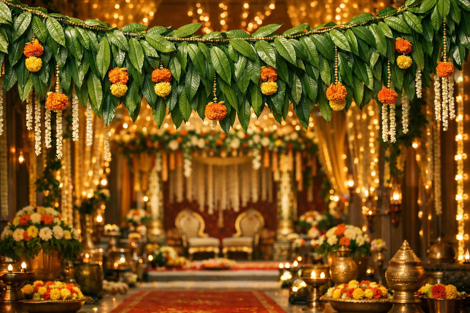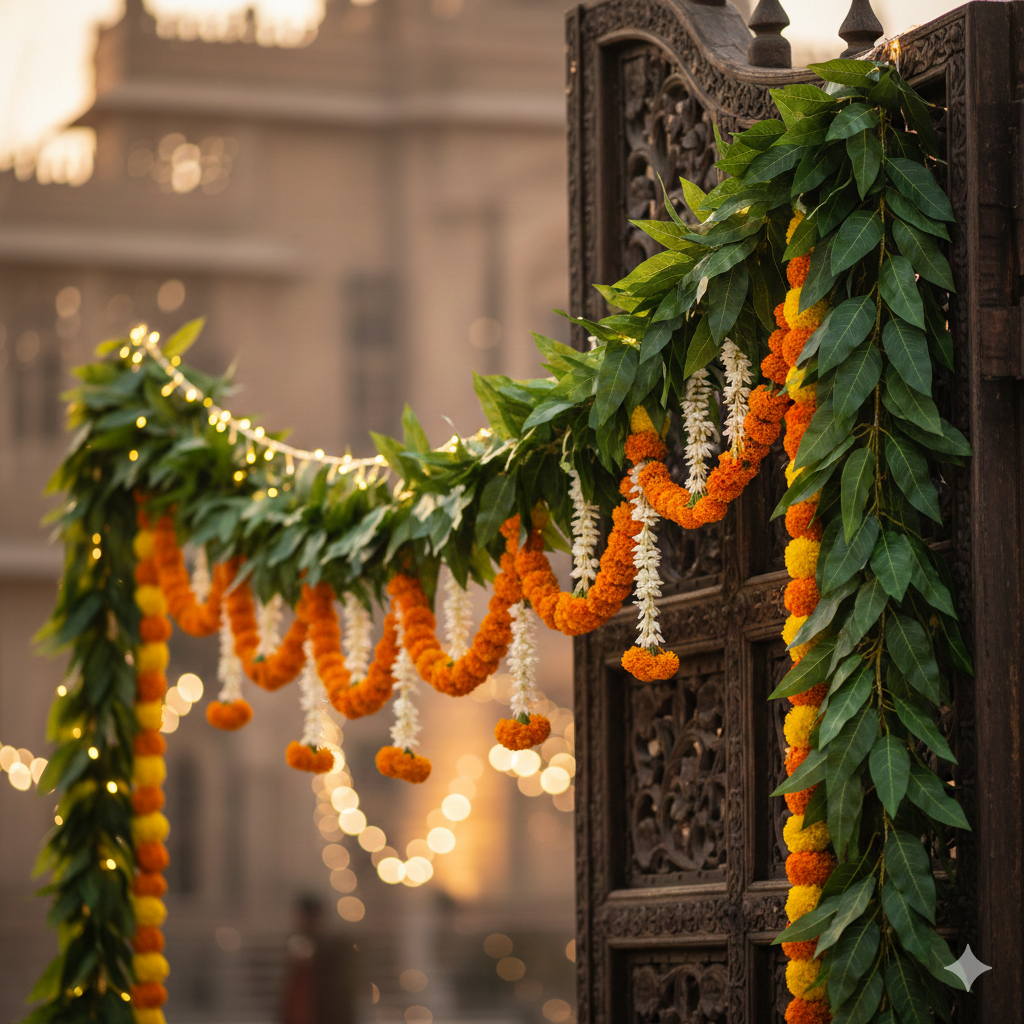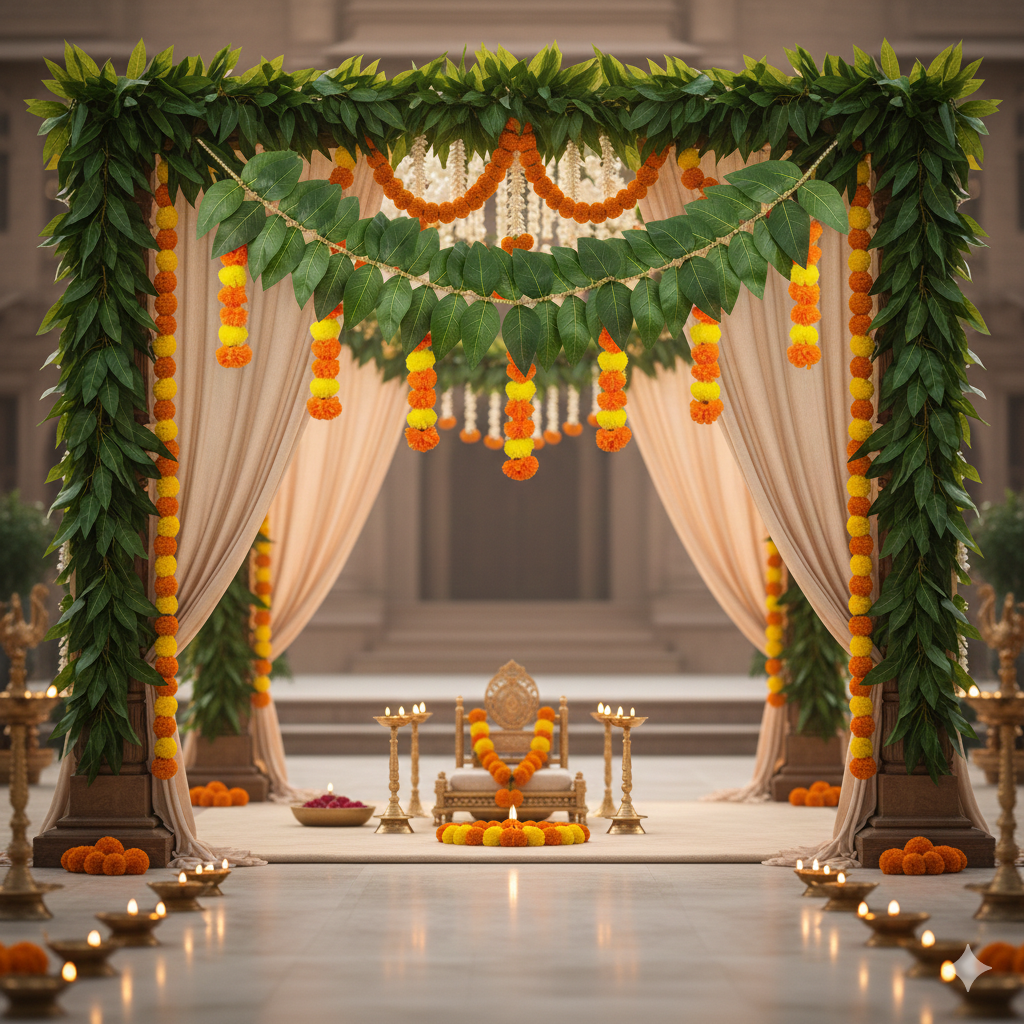 Enhance your weddings and traditional celebrations with auspicious mango leaf décor, beautifully crafted for mandaps, entrances and festive setups with natural elegance.